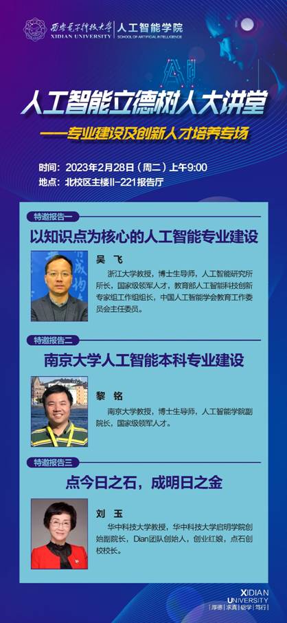 为进一步加强专业建设,落实立德树人根本任务,全面提升人工智能领域专业人才培养质量,pa集团邀请浙江大学吴飞教授、南京大学黎铭教授、华中科技大学刘玉教授,于2023年2月28日(周二)在PA集团官网北校区主楼II-221报告厅,围绕人工智能专业建设和创新人才培养为我们带来报告、交流。欢迎广大教师前来聆听交流!