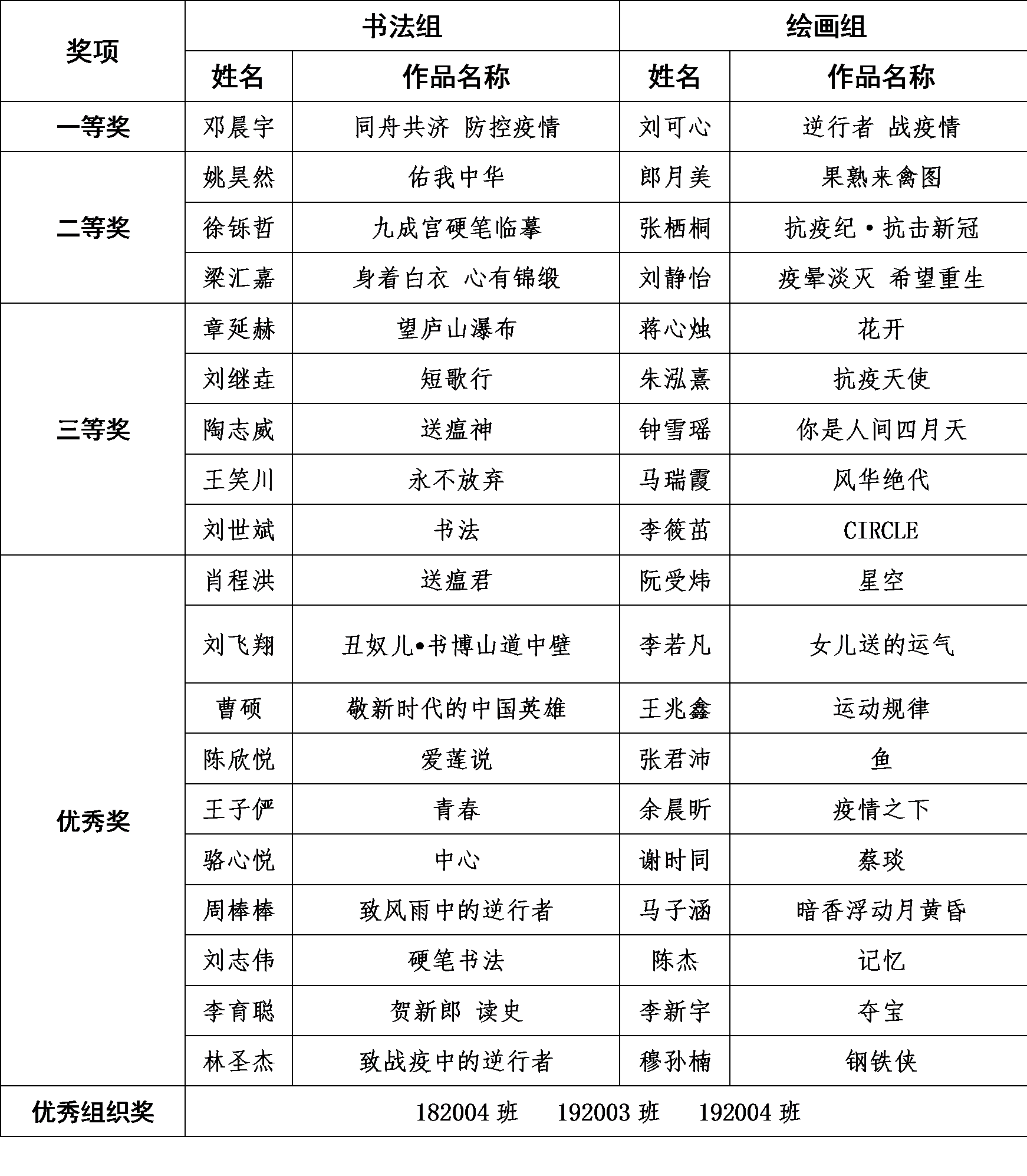 此次活动在4月30日正式开始,面向pa集团官网入口全体本科生公开征集书法和绘画主题作品,得到了同学们的热烈响应,通知当晚便有同学提交了作品。在为期两周的创作时间内,智能学子们行文如流水,落笔如云烟,一幅幅构思精巧,创作精良的作品呈现出来。本次活动共计收到学生作品50余件,经过线上投票与评委线下打分,最终由邓晨宇创作的书法作品《同舟共济 防控疫情》摘得书法组一等奖,绘画组一等奖则由刘可心创作的《逆行者 战疫情》获得,182004等三个班级荣获“最佳组织奖”。