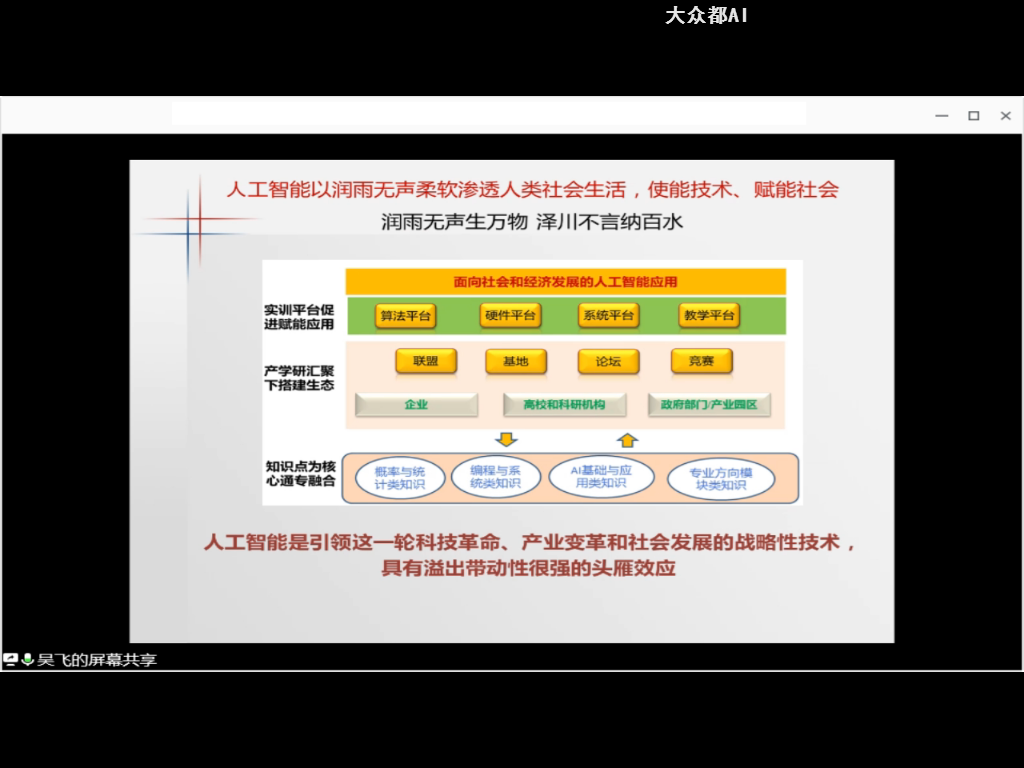 吴飞教授围绕“学科交叉、产学联动促进人工智能人才培养”的主题,回顾了人工智能的诞生、1956年令人激动的达特茅斯会议,介绍了浙江大学的人才培养之路,以智能司法为例,提出了学科协同科研攻关项目方向。