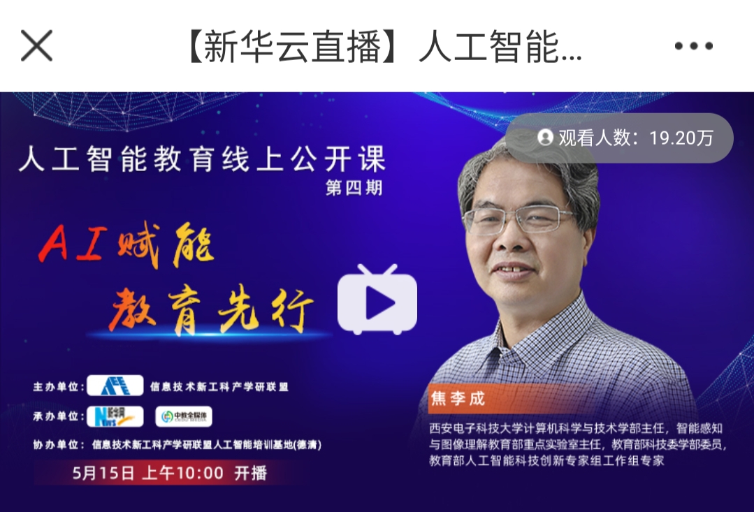 2020年5月15日,由信息技术新工科产学研联盟主办,华网、中教全媒体承办,信息技术新工科产学研联盟人工智能培训基地(德清)协办的“人工智能教育线上公开课”第四期,在新华网客户端云直播及中教全媒体直播平台同步播出。计算机科学与技术学部主任、pa集团官网入口焦李成教授做了题为“人工智能人才培养的挑战与思考”的精彩报告。