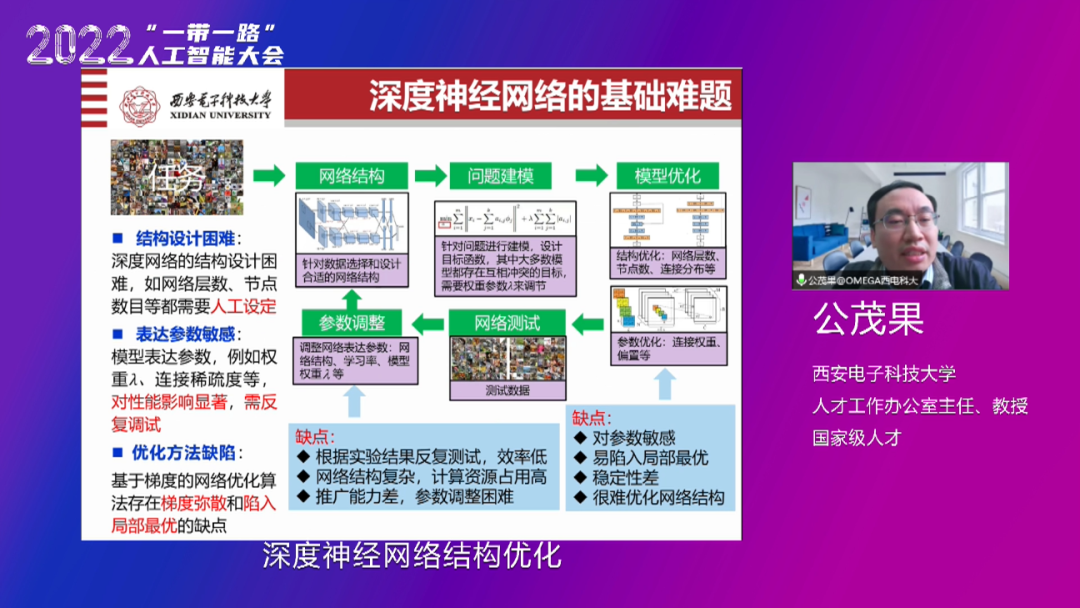 国家级人才、PA集团官网公茂果教授的报告介绍了团队近期在解决深度神经网络结构优化难题上的一些思路和尝试,以及在深度神经网络应用上的一些新进展。公茂果教授的报告从四个方面展开,第一,深度神经网络的优势和困难。深度神经网络的优势包括:深层结构,复杂建模,特征学习,自主分析,推广性强,应用广泛。深度神经网络的困难包括:结构设计困难、表达参数敏感和优化方法缺陷。第二,深度神经网络结构优化初探。具体分为以下五个方面:1.避免表达参数。2.超越梯度优化。团队提出的自然梯度优化结合了华为昇腾AI计算芯片中使用的达芬奇架构,可以批量化的计算小矩阵的逆,能够进一步提升计算效率。3.神经网络压缩。团队提出了网络流数据分类的神经网络压缩方法,将生成对抗训练和知识蒸馏相结合,并对网络重要性因子进行稀疏约束,达到网络裁剪目的,得到压缩率与准确率的平衡。4.隐私保护学习。针对数据分散且无法集中收集或共享的问题,团队提出了多方对偶学习,通过对偶预测补全缺失数据,保持原有数据结构不变,重叠验证扩充训练数据。此框架同时保护了数据隐私性和计算安全性。5.训练样本学习。团队提出了SPL模型和MOSPL模型,通过协同训练产生预测概率对节点进行排序,采用自步学习逐步将节点加入到训练集中,一方面将高置信度的伪标签扩充至训练集,另一方面减轻难以分类的节点对模型训练产生的扰动。第三,遥感影像变化检测应用探索。公茂果教授从遥感影像变化检测、多类变化检测、超像素变化检测、多视角变化检测、特定目标变化检测以及高光谱影像变化检测等多个方面进行了应用探索。最后,公茂果教授对深度神经网络结构优化的未来发展方向进行了展望。