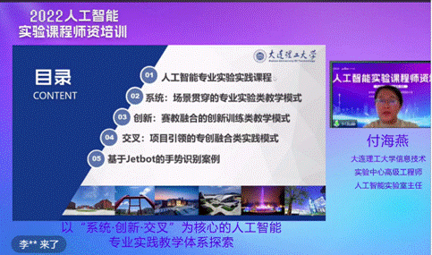 大连理工大学人工智能实验室主任付海燕老师带来“以“系统·创新·交叉”为核心的人工智能专业实践教学体系探索”。她从学校人工智能专业实验实践课程体系设置、专业实验类教学模式设计、实验案例实施情况等方面做了分享。在实验课程设计过程中通过多场景贯穿、赛教融合、科研项目融入等方式,保证了实验内容很好地服务于人工智能人才实践能力培养,在学科竞赛中取得了优秀成绩。精彩的案例分享中,实验设计、课程思政、专业教育与家国情怀培育同向同行等内容,为高校人工智能实践教学提供了良好启发。