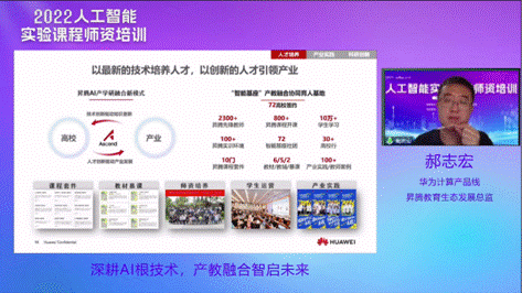 华为计算产品线昇腾教育生态发展总监郝志宏做题为“深耕AI根技术,产教融合智启未来”主题报告。他首先介绍了华为在前期昇腾人工智能教育生态方面的工作基础,以及对相关专业人才培养提供的支撑作用。校企共同梳理人工智能核心课程,围绕实验以最新的技术服务高校实践教学环节,通过产教协同创新人才培养引领产业发展。他表示,企业后续将继续促进产业实际案例融入,共同开展实验课程师资培训,丰富教学资源设计和平台搭建,与高校共同赋能人工智能高层次人才培养。
