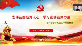 (通讯员 杨贵鹏)为深入学习贯彻党的十九届五中全会精神,12月22日下午,pa集团官网入口硕士党支部在线上组织进行十九届五中全会精神宣讲活动,硕士191支部书记杨贵鹏和硕士202支部书记王璐围绕“宏伟蓝图鼓舞人心,学习宣讲凝聚力量”的主题进行了宣讲,全体党员及积极分子参加。