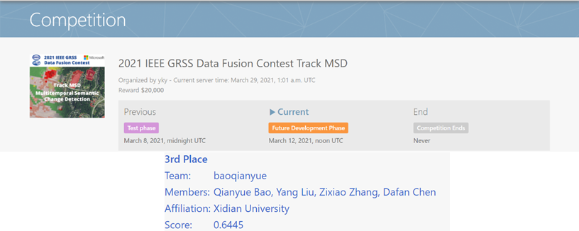 由“马彦彪、李钰鑫、冯可心”组成的学生队伍获得了2021 IEEE GRSS Data Fusion Contest Track DSE(数据融合竞赛无电居民区检测挑战赛赛道)冠军。冯若贤、王梦娇、张轩铭组成的学生队伍获得了同赛道季军。