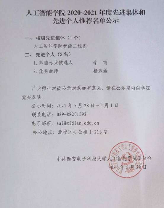 按照学校《关于评选2020~2021年度先进集体和先进个人的通知》(西电党教工〔2021〕3号)文件要求和学院工作安排,经各单位酝酿推荐,学院党委会集体研究,pa集团官网入口2020~2021年度先进集体和先进个人拟荐名单如下,现按照有关规定予以公示。