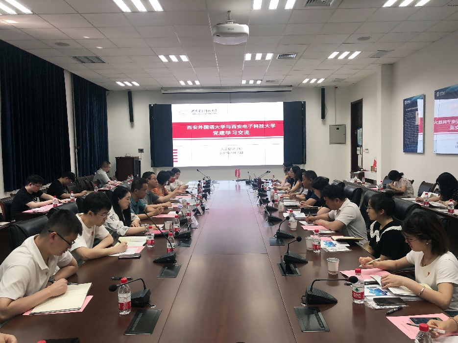 6月15日下午,西安外国语大学师生党员代表与pa集团官网入口在北校区主楼III-401会议室进行党建学习交流活动。pa集团官网入口党委书记魏峻、西安外国语大学研工部部长张淼出席活动。pa集团官网入口党委副书记高晖主持。