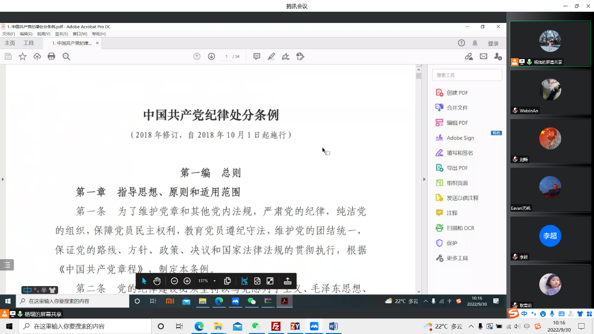 为抓好纪律教育学习的组织落实,博士第一党支部把纪律教育宣传月活动列入支部工作重要议事日程,采取了一系列措施确保教育活动落到实处。9月12日,支部召开支委会,党支部书记刘梦琨传达了《pa集团官网入口党委关于在全院开展纪律教育宣传月活动的通知》文件精神。会议强调,要把纪律教育学习宣传月活动作为支部加强作风建设的重要抓手,深入开展党性教育、纪律教育、警示教育和廉洁文化教育,深化廉洁校园建设,为扎实落实好立德树人根本任务营造风清气正的校园环境。随后,支委会研究活动实施方案,细化量化活动时间、内容、方法、步骤等,为保证活动取得实效奠定了基础。