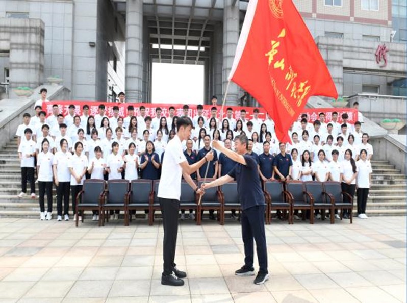 孙政为代表团授旗,同时将学校的关怀、期望传递给了所有教练员、运动员。运动员接过印有“beat365在线唯一官网”字样的团旗,现场挥舞,展示了师院健儿拼搏奋进的决心和信心。