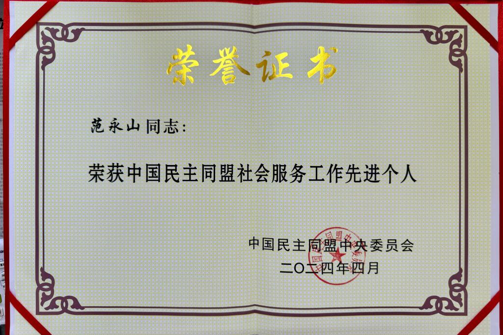 以参政议政为要务,以服务社会为宗旨,范永山教授发挥自身优势,勇担社会责任,多次被评为社情民意先进个人以及省级优秀盟员,深受社会各界好评。
