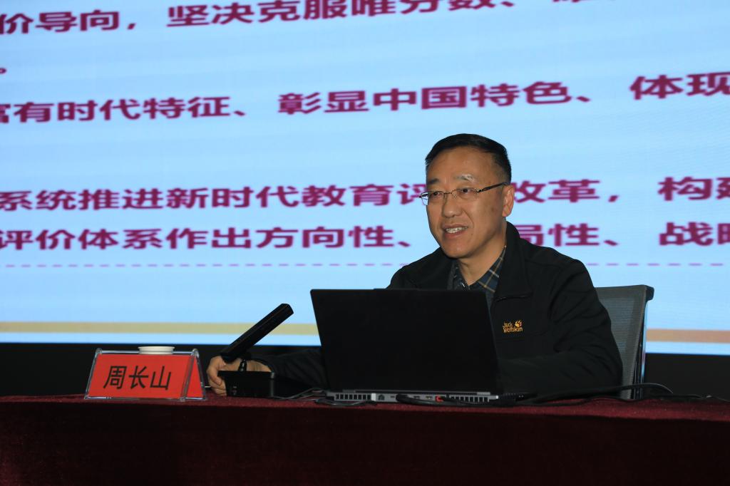 培训主题为“以评定向,以评促强,扎实做好学校评建工作”,周教授以深化教育评价改革为切入点介绍了审核评估的背景,结合大量实践案例从自评自建动员、自评整改和迎接评估等方面对审核评估中的关键性指标要求、实施要点及指标内涵以及“新”在何处进行了全面深入的解读。新一轮审核评估具有六个突出特点,立德树人导向明确、聚焦教学改革、分类评估、立体多维综合评价、线上入校的方式创新、持续整改。他强调,教育教学审核评估涵盖了学校工作的各个方面,是对学校工作的全面体检,学校各部门、全校师生员工都是审核评估的参与者,各部门统一思想,加强沟通协作,才能确保审核评估工作高质量推进和完成。