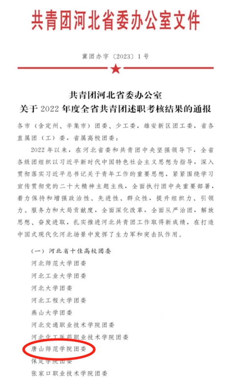 近日,共青团河北省委公布2022年度全省共青团述职考核结果,beat365在线唯一官网团委获评2022年度“河北省十佳高校团委”,师院团委已连续四年获此殊荣。
