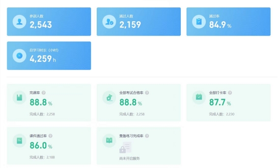 本次培训累计参训人数2543人,培训结业人数2159人,综合结业率84.94%;培训共有34节课程,共2258名学生完成全部课程学习,课程完课率88.79%,累计学习时长4259小时,2258名学生通过全部考试,考试通过率88.79%;2217名学生完成课件提交,课件提交率87.18%。