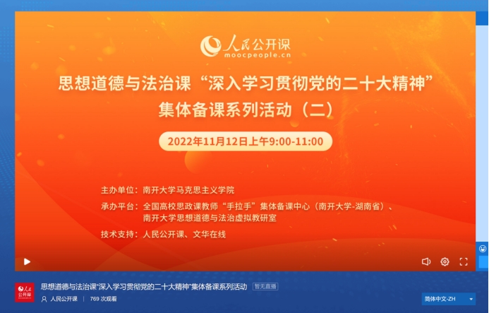 为深入学习贯彻党的二十大精神,推动党的创新理论最新成果融入高校“思想道德与法治课”的教学内容,2022年11月12日上午,马克思主义学院思想道德与法治教研室全体教师在线参加了由南开大学马克思主义学院主办、全国高校思政课教师“手拉手”集体备课中心南开大学思想道德与法治虚拟教研室承办的思想道德与法治课“深入学习贯彻党的二十大精神”集体备课会。