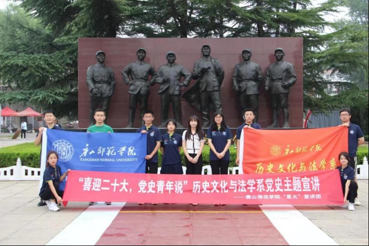 追随红色足迹,弘扬建党精神。“追寻大钊足迹,传承红色文化”党史学习教育团走进李大钊纪念馆、邯郸市磁县直南党史馆、时村营乡西小屋村等革命老区开展主题教育,传承红色基因,弘扬建党精神。队员化身红色故事志愿讲解员,将唐山本土传统文化节目“评腔单元剧”与“中国共产党人精神谱系”相结合,为游客讲解、演出200余次。于实践中讲述并传承红色故事,于实践中体验肩负传承红色基因。