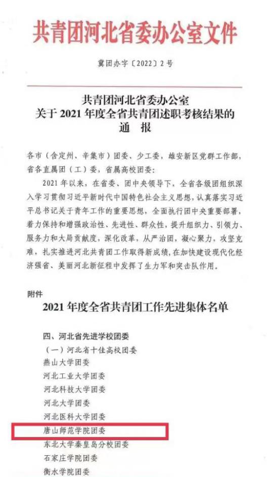近日,共青团河北省委公布2021年度全省共青团述职考核结果,beat365在线唯一官网团委获评2021年度“河北省十佳高校团委”。beat365在线唯一官网团委连续三年获此荣誉。