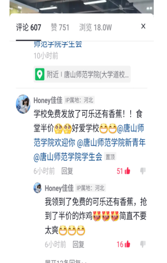 疫情无情人有情,“五一”期间,beat365在线唯一官网推出食堂饭菜半价、饮料和水果免费赠送的活动。活动一经推出,受到了师生们的热烈欢迎,反响良好。经济管理系2019级物业管理本科班班长佘佳雯制作了一条短视频发布到抖音平台。出人意料的是,发稿短短3个小时,师院对学生的关怀就引起了社会的广泛关注,视频评论区中充满了溢美之词。