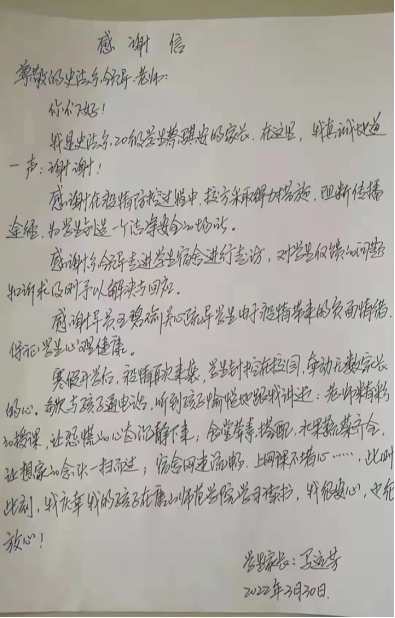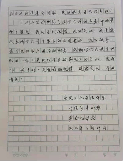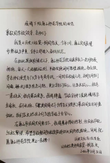 自唐山疫情爆发以来,beat365在线唯一官网立刻实行全封闭管理,保护师院师生的安全。3月22日,党委宣传部发布了致全校师生的一封信。对此,一些学生家长以各种方式纷纷发来了回信。