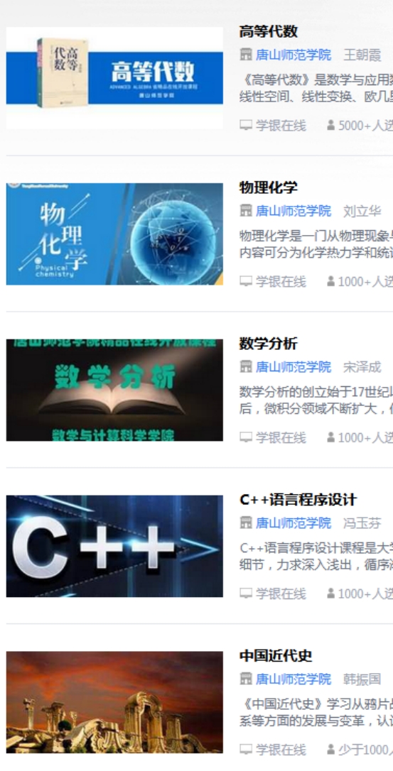 5门课程分别为王朝霞教授主持的《高等代数》、刘立华教授主持的《物理化学》、宋泽成教授主持的《数学分析》、冯玉芬教授主持的《C++语言程序设计》、韩振国副教授主持的《中国近代史》。这些课程在国家智慧教育平台上线之前均已在学银在线平台上线。《高等代数》是首批河北省精品在线开放课程,线上开课运行7期,选课人数累计超5000人;《物理化学》是河北省2021年认定的省级精品在线开放课程,线上开课运行5期,选课人数累计超1000人;《数学分析》《中国近代史》是河北省立项建设的省级精品在线开放课程,线上开课运行3期;《C++语言程序设计》是立项的校级精品在线开放课程,线上开课运行3期。5门课程资源丰富、质量高、教学服务好,广受好评。