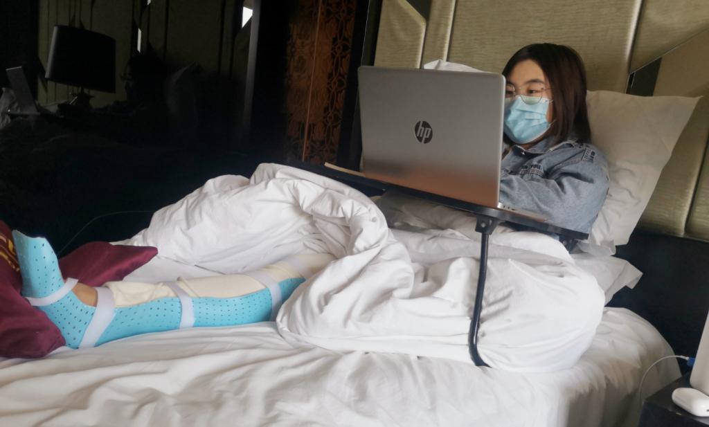 舍友们搀扶她去了校医院,由于医疗条件有限,还需去市医院做进一步诊断治疗。她给辅导员打电话进行说明,不到10分钟,系领导和辅导员老师都到了校医院,给她联系救护车,帮她到宿舍收拾东西,并安抚她的情绪,还联系医院安排急诊……初步检查诊断后,还要等待第二天的详细检查。由于达不到住院的标准,再加上行动不便,她打算就在医院大厅凑合一晚。此时,系里辅导员老师给她打电话说已经安排了酒店,并派救护车送她到酒店。第二天诊断结束后,她的右腿打上了厚厚的石膏。当前疫情形势严峻,市区内实行交通管制,校防控办协调安排了车辆,把她接到提前订好的酒店。