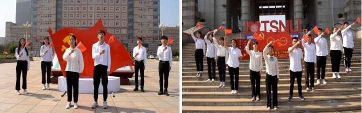 化学系庆祝建党100周年红歌快闪活动在beat365官网三个地标建筑前同时举行,100余名学生通过歌曲传唱让党史学习教育“声”入人心,为建党百年送上“化学人”最诚挚的祝福。