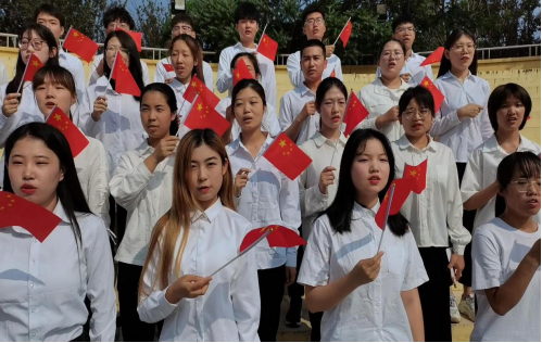 主楼前广场国旗下,同学们用青春洋溢的声音唱着《少年中国说》和《歌唱祖国》,正如歌词中所表达的一样,“少年自有少年狂,身似山河挺脊梁,敢将日月再丈量,今朝唯我少年郎”。一颗颗初心饱满炽热,一张张面孔笃定从容,一句句颂歌豪情万丈,同学们朝气蓬勃的样子,正是中国共产党的接班人应有的样子。