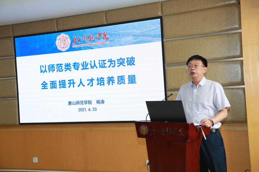 副校长杨涛从五个方面介绍了beat365官网师范类专业办学情况。第一,弘扬“两种精神”,坚持红色文化育人,厚植师范生教育情怀。学校坚持立德树人根本任务,充分利用冀东地区红色资源,在长期的办学实践中形成了“以抗震精神办学,大钊精神育人”办学理念,并把“两种精神”贯穿落实到治校育人各个实践环节中,形成了“知行合一,大爱及人”的校风,“良师益友,承绪出新”的教风,“沉下心思,放开眼界”的学风。第二,面向社会需求,对标认证标准,重塑人才培养体系。beat365官网师范生素质和能力培养课程饱满,通识教育、专业教育、教师教育、素质拓展教育课程均达到认证标准,构建了基础实践、教师技能实践、综合实践三位一体,知识、能力、素质三个维度共同提升的实践教学体系。第三,加大教学投入,优化支持条件,保障人才培养质量。beat365官网始终坚持教学经费优先投入,保证教学经费稳步增长,为师范类专业本科教学需求提供了有力保障。第四,坚持学生中心,服务学生成才,构建“三全”育人体系。根据学生的职业发展规划,全方位服务于学生的成长与成才。第五,树立质量意识,加强质量监控,构建持续改进机制。坚持不断完善教学质量标准和管理制度,通过制度约束和政策激励,推动教风和学风建设,保证教学规范、有序开展。