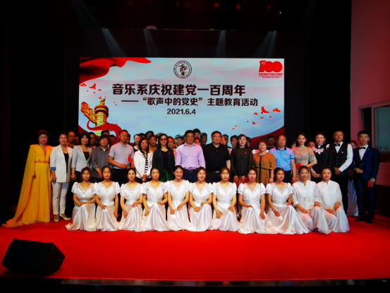 活动中,音乐系的师生们精彩演绎了《你是一面旗》、《红梅赞》、《多想对你说》、《红星闪闪》、《红星照我去战斗》等多首耳熟能详的经典曲目,一首首富含时代印记的红色经典作品,伴随着师生讲述的红军小战士潘冬子打土豪分田地的故事、共产党员江姐和众狱友在渣滓洞监狱绣红旗的感人事迹、革命烈士黎明前血与火的考验以及为革命牺牲的壮烈场面,以及李大钊先生“铁肩担道义,妙手著文章”的博大胸怀和“挽救民族、振奋国群”的坚定信念,回顾了党在危难中奋起、于战火中涅槃,始终同人民风雨同舟、生死与共,从胜利走向胜利的伟大历程,深刻感悟中国共产党带领中华民族在谋幸福、谋复兴奋进历程中的辉煌成就和丰富精神内涵。尤其是音乐系师生创作、改编的歌曲《逐梦新征程》、舞蹈《心声》、评腔剧《少年李大钊》、音乐情景剧《绣红旗》、古筝《山丹丹开花红艳艳》等作品,更是用中国经典的传统音乐与当代文化相结合的方式,通过歌曲、器乐演奏、舞蹈、音乐剧等多种文艺形式讲述中国共产党的百年进程,表达了师生对党的深厚情感。活动现场,歌声、乐声、掌声相互交织,大家或拍掌应和,或轻声跟唱,台上台下频频互动。百名师生大合唱《入党誓词》更是将主题教育活动推向了高潮。
