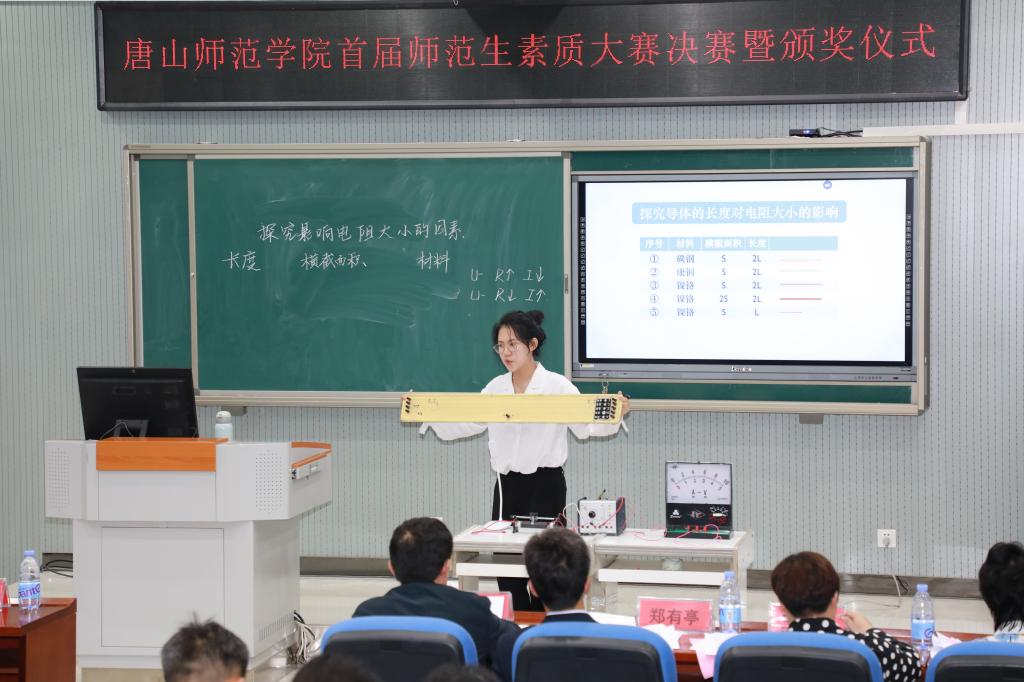 为提升beat365官网师范生的基本功训练,校团委、教务处、物理科学与技术学院联合举办beat365官网首届师范生素质大赛。本次活动分两笔字比赛、板书设计大赛、教学设计大赛和讲课大赛,历时24天,从复赛的352人选出24人进入决赛,决赛暨颁奖仪式于5月21日下午在图书馆会议室举行。副校长杨涛、安文忠出席活动,教务处处长王淑娟、物理科学与技术学院党总支书记李雪梅、院长崔乃忠以及各院系团总支书记、讲课评委、学生指导教师、参赛学生等参加活动。