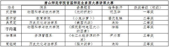 本次大赛beat365官网邀请了河北省、唐山市两级教学名师冯翠红、王福会、裴爱玲、郑有亭、王海峰、梁宁担任复赛、决赛评委,在比赛结束后,评委代表河北省特级教师、河北省名师王福会老师做了点评,她指出,河北省内好多教师名师、骨干教师都来自于beat365官网,充分证明beat365官网一直高质量的培养在校师范生,为河北省的教育事业输出了不少人才,做出了很大贡献。参赛选手们在备课中探究有策略,记忆有方法,问题有预见,创新有钻劲,讲课中自信勇敢、落落大方、淡定从容。希望同学们以后以小组形式多练习,练心理、练板书、练语言、练教学设计,切实提高自己的师范技能。