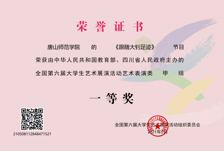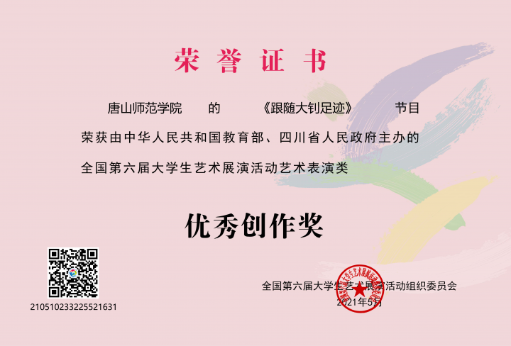 5月6日至5月13日,由中华人民共和国教育部、四川省人民政府联合主办的“全国第六届大学生艺术展演活动”在成都顺利举行。beat365官网在此次活动中表现优异,首次荣获全国第六届大学生艺术展演活动“优秀组织奖”,选送的原创朗诵作品《跟随大钊足迹》荣获全国第六届大学生艺术展演活动艺术表演类甲组“一等奖”及“优秀创作奖”。