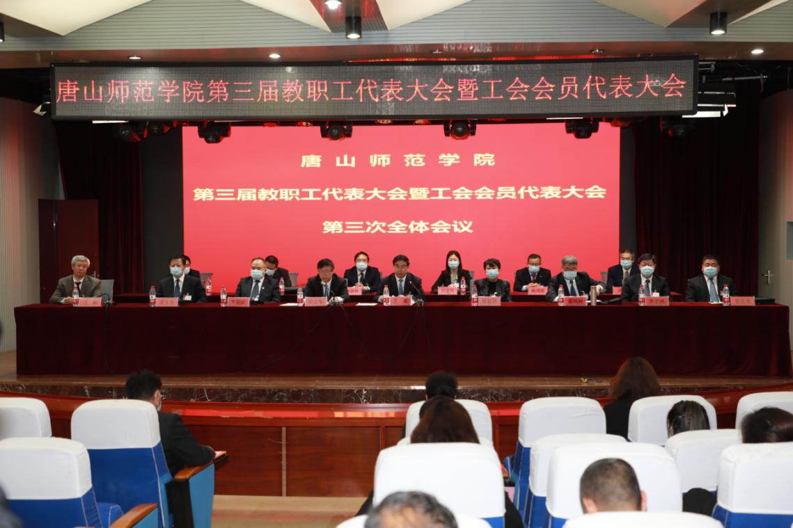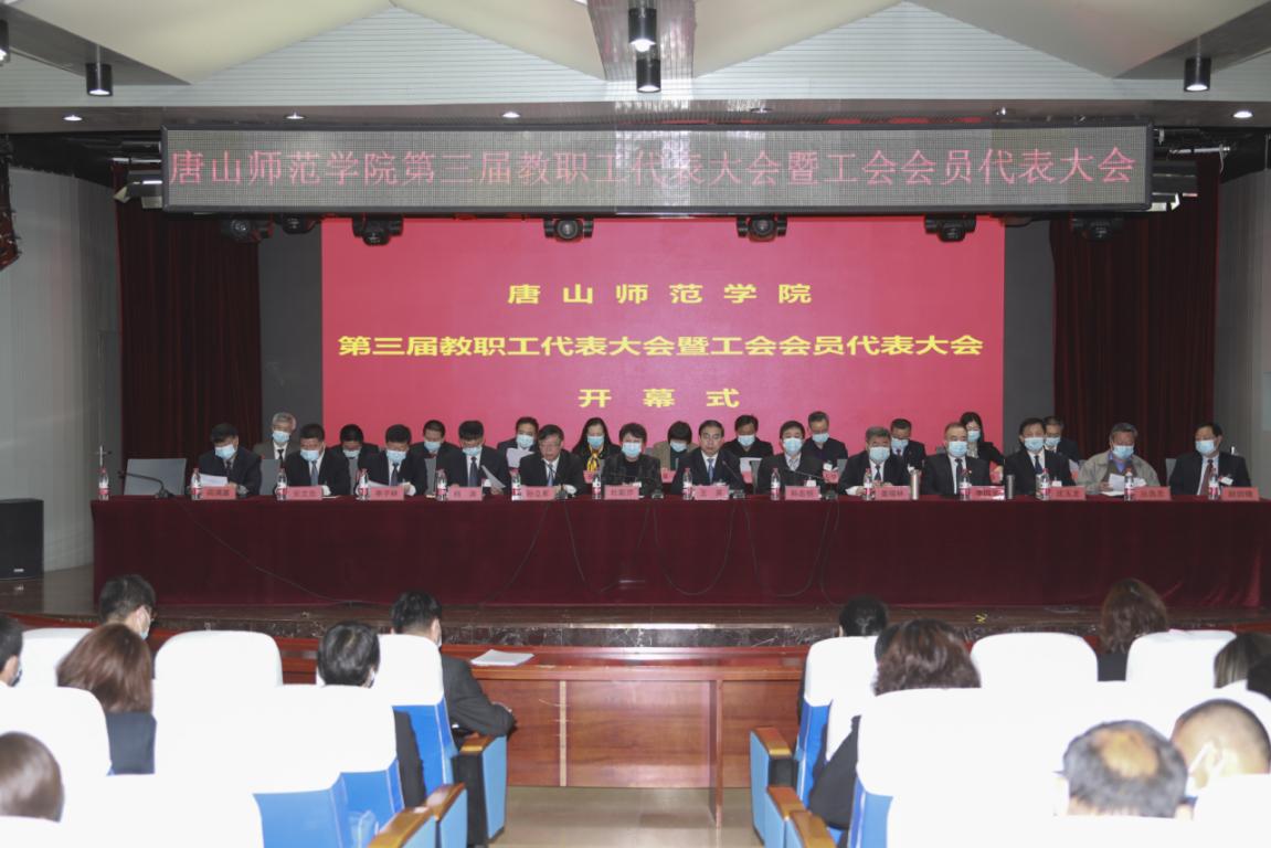 4月23日至24日,beat365官网第三届教职工代表大会暨工会会员代表大会在学校会议中心顺利召开。全体学校领导和唐山市教科文卫工会主席孙志恒,原beat365在线唯一官网院长丛选忠、原beat365在线唯一官网副院长阎满富出席大会,特邀嘉宾华北理工大学工会主席吴飞、唐山学院工会主席魏占学、唐山职业技术学院工会主席李静、唐山工业职业技术学院工会副主席安妍和大会主席团成员在主席台就座。大会由党委副书记孙立军主持。
