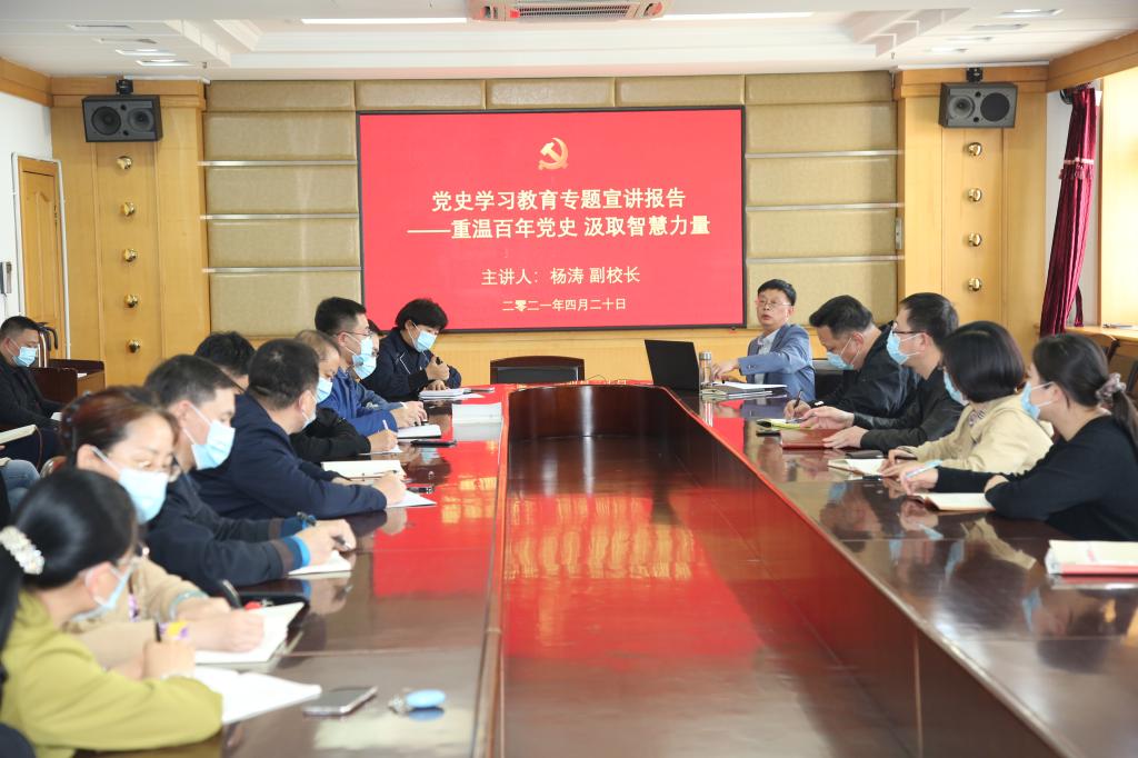 4月20日下午,在主楼五层会议室,副校长杨涛以“重温百年党史 汲取智慧力量”为主题进行党史学习教育专题宣讲。人事处、教务处、信息技术中心、现代教育技术中心、教科所、实验管理中心6个行政教辅部门的全体同志参加了此次会议。