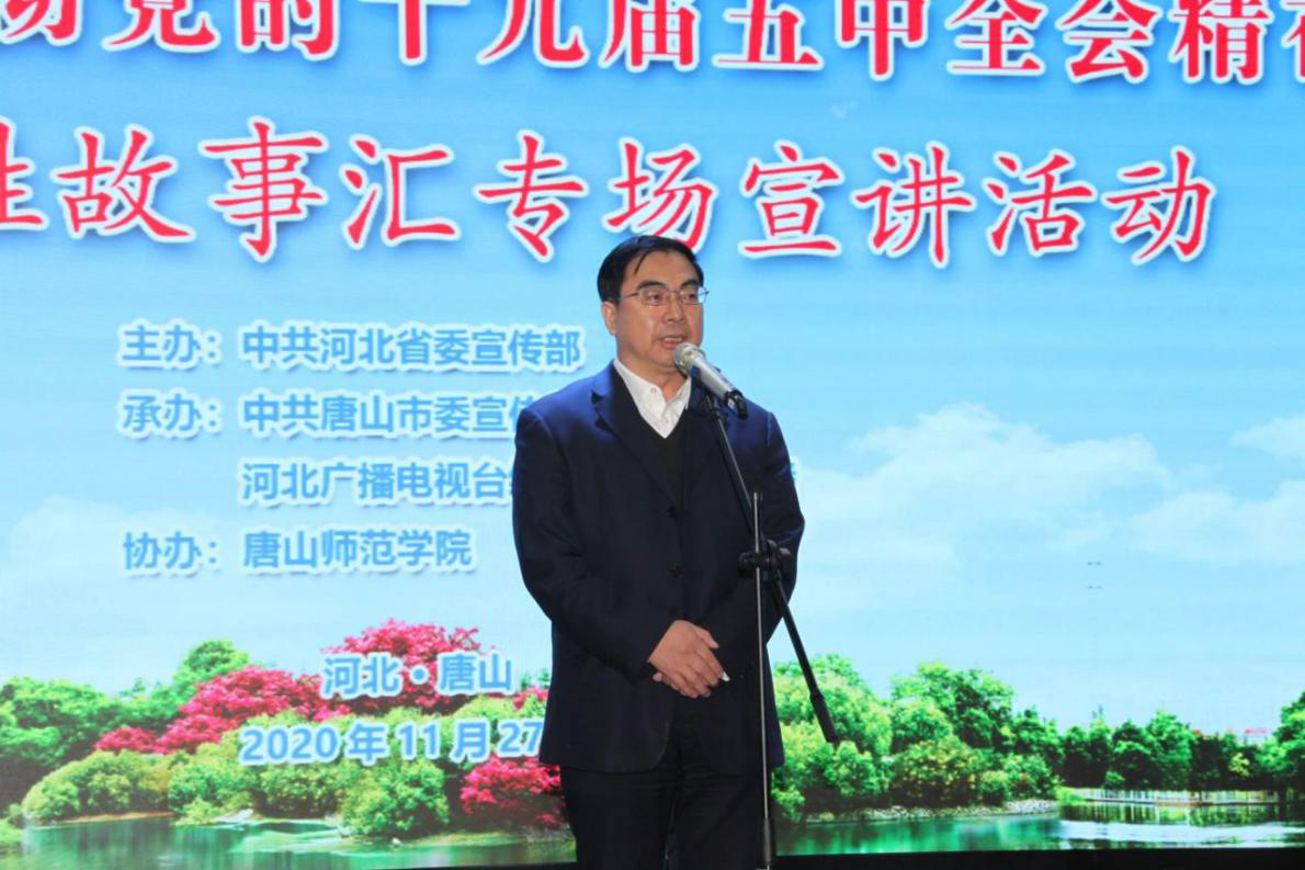 11月27日上午,由中共河北省委宣传部主办,中共唐山市委宣传部、河北广播电视台经济(故事)广播承办,beat365官网协办的学习宣传贯彻党的十九届五中全会精神——365百姓故事汇专场宣讲活动在beat365官网大学道校区南院会议中心举行。出席活动的省市领导有省委宣传部部务会成员、二级巡视员贾敬刚、唐山市委宣传部副部长张梅艳、省委宣传部基层宣传教育处处长孙雷、省委宣传部基层宣传教育处二级调研员刘润苍、河北广播电视台生活频率群副书记、经济生活频率总监杨美楷、省委宣传部基层宣传教育处一级主任科员石立雄、市委宣传部宣传教务处李晓兰处长。会前,党委书记王英、校长杜彩芹、党委副书记孙立军接见了各位领导并进行了亲切交流。来自全省各地的百姓故事汇优秀宣讲选手,中央和省、市主要新闻媒体记者,王英书记、孙立军副书记及师生代表参加宣讲活动。张梅艳副部长、王英书记分别向大会致辞。