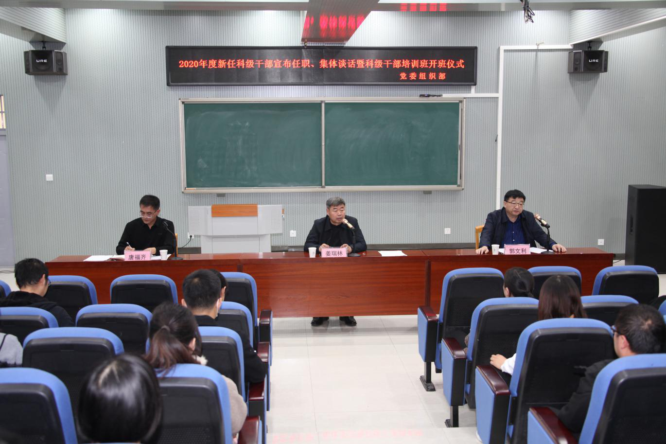 随后,姜瑞林副书记对与会人员进行集体谈话并提出四点要求。一是旗帜鲜明讲政治,争做“信念坚定”好干部。要坚定理想信念、做到对党忠诚,强化政治理论武装,不断加强政治素养,做到对党绝对忠诚,做政治上的“明白人”。二是持续深入抓学习,争做“严谨细致”好干部。要持续深入学习习近平新时代中国特色社会主义思想和党的十九大、十九届历次全会精神和《习近平谈治国理政》第三卷重要内容,在学懂、弄通、做实上持续用力、狠下功夫,努力成为本职工作的行家里手。三是勤勉高效履职,争做“务实担当”好干部。要彻底解决在工作上不思进取、办事拖拉、效率不高、落实不力的问题,做到遇到矛盾不绕行、解决问题不推脱,在破解矛盾和问题中锤炼作风、提升能力。四是严格修身自律,争做“清正廉洁”好干部。要坚持从严要求,增强廉洁意识,带头自觉遵守廉洁自律各项规定,强化自我教育、自我管理、自我约束,主动置身于党组织、党员和群众的监督之下,把握防线、严守底线。他强调,科级岗位是贯彻落实上级和学校党委决策部署的最后一公里,要充分发挥科级干部的主力军作用,希望大家加倍珍惜党组织的厚爱和重托,勇于担当负责,在新岗位上以实际行动践行新时代好干部标准。集体谈话结束后,姜书记围绕“端正思想,提高认识”、“珍惜机会,学以致用”、“严格纪律,确保效果”三方面对科级干部培训班做了动员讲话。