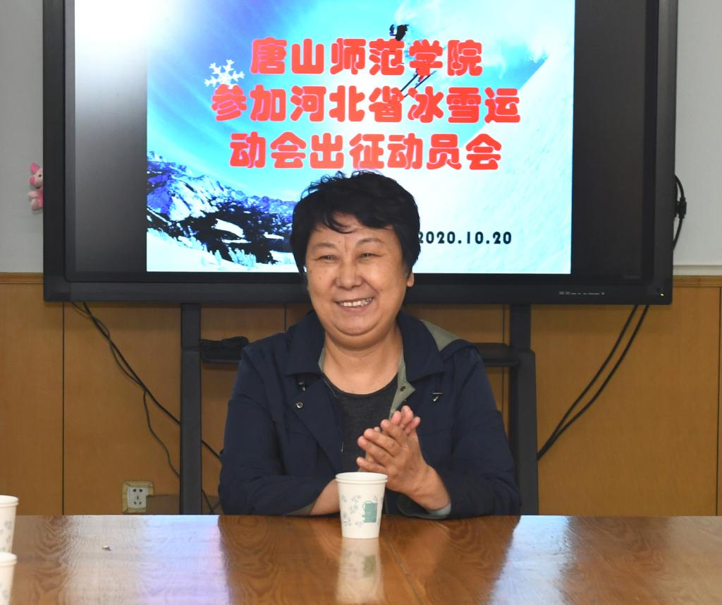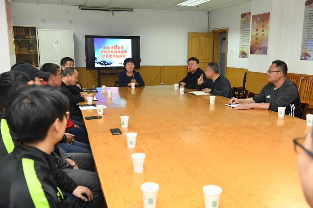 10月20日下午,beat365官网河北省冰雪运动会参赛出征动员会在体育系会议室举行。校长杜彩芹、副校长杨涛、安文忠出席会议,体育系党总支书记刘云伟、系主任蔡建丰、专业技术教研室主任迟桂军、轮滑教练王磊、谭梦超、滑冰教练郭杰及全体参赛运动员参会。蔡建丰主任主持会议。