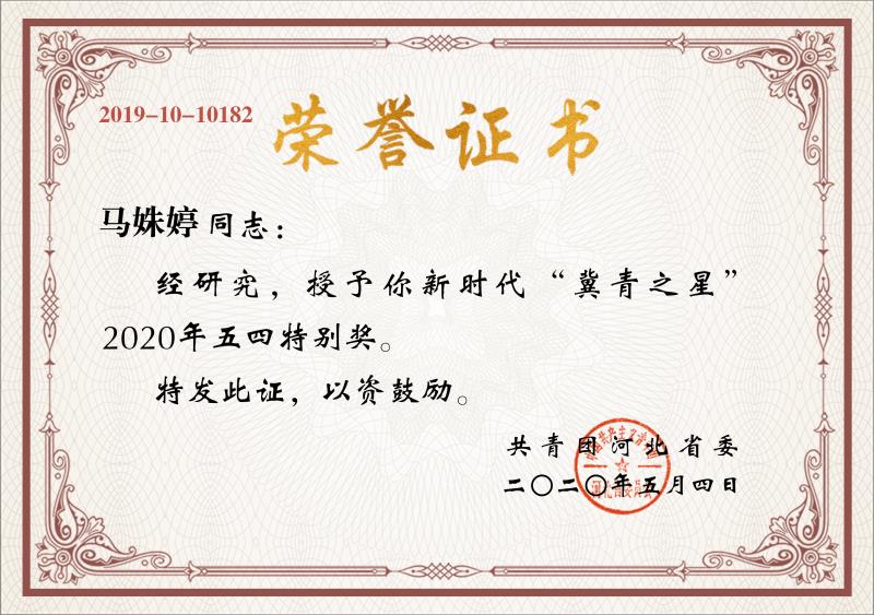 马姝婷在高中期间就曾获得“河北省省级优秀共青团员”、“河北省省级三好学生”、“唐山市市级三好学生”等多个荣誉称号,今年她还被团省委授予“新时代‘冀青之星’2020年五四特别奖”。作为“00后”大学生,她勇担新时代青年责任。新冠肺炎疫情爆发后,她第一时间投身社区疫情防控工作,并利用多种形式服务群众,至今还服务在社区疫情防控工作岗位上。马姝婷品学兼优、吃苦耐劳、认真负责、乐于助人,为青年团员树立了良好榜样。