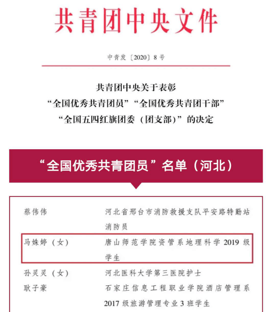 五四青年节前夕,共青团中央办公厅印发《共青团中央关于表彰“全国优秀共青团员”“全国优秀共青团干部”“全国五四红旗团委(团支部)”的决定》,beat365官网资源管理系2019级地理科学专业学生马姝婷荣获“全国优秀共青团员”称号。