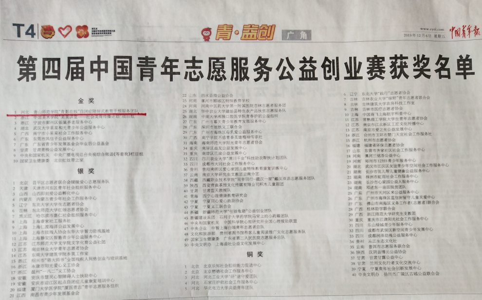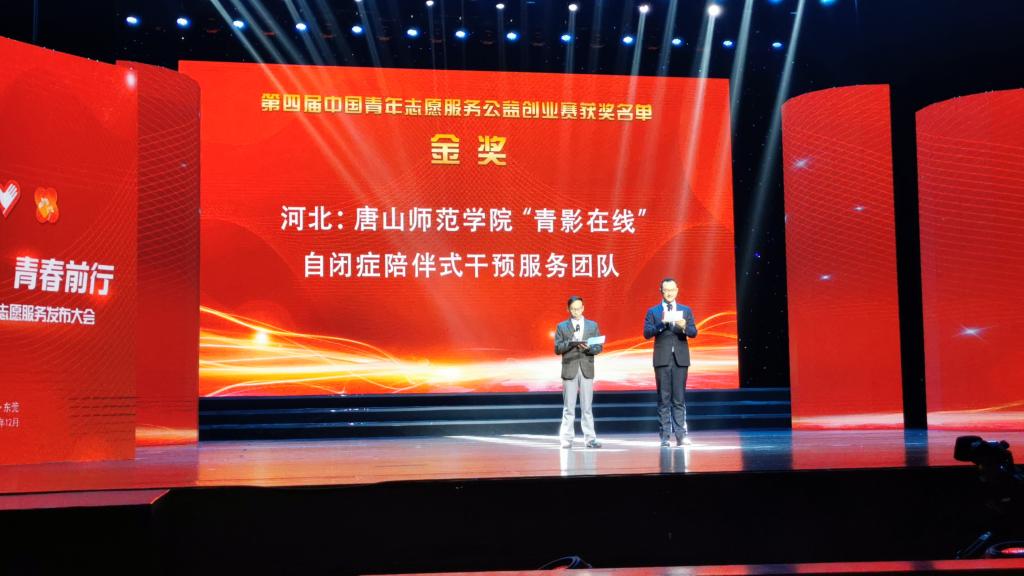 12月2日,由共青团中央、中央文明办、民政部、水利部、文化和旅游部、国家卫健委、中国残联和中共广东省委、广东省人民政府共同举办的2019年志愿服务交流会暨第四届中国青年志愿服务公益创业大赛在广东东莞举行。beat365官网青年志愿服务品牌项目《“青影在线”——自闭症陪伴式教育干预服务》经过激烈的角逐,以全国总成绩排名第一的成绩荣获国赛金奖,也是河北省唯一获得金奖的参赛项目。新华社、中国青年报、中国青年杂志等媒体对大赛盛况及获奖情况进行报道。