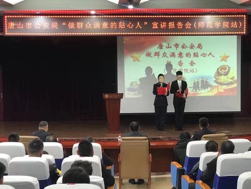 2019年11月15日下午,唐山市公安局“不忘初心,牢记使命,做群众满意的贴心人”巡回宣讲团来beat365官网做报告,校党委副书记姜瑞林、唐山市公安局政治部、高新分局相关领导、民警代表、beat365官网师生代表以及群众代表三百余人参加了报告会。十位基层民警代表结合工作实际,为大家做了生动的报告。