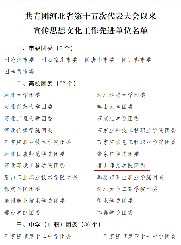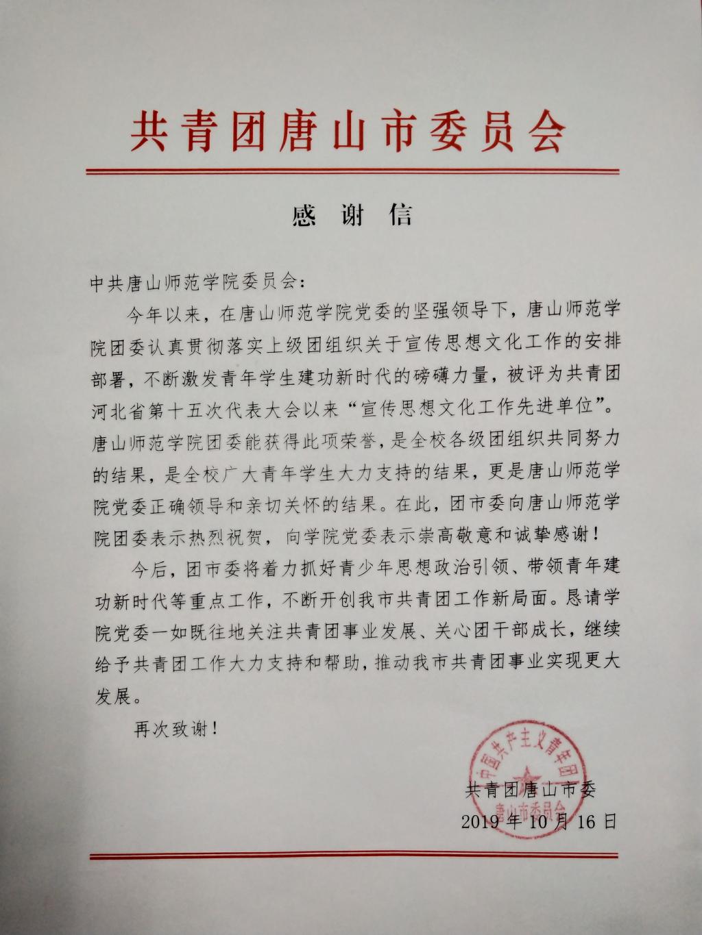 beat365官网团委荣获河北省共青团“团省十五大以来宣传思想文化工作先进单位”称号,共青团唐山市委向学校发来了感谢信。