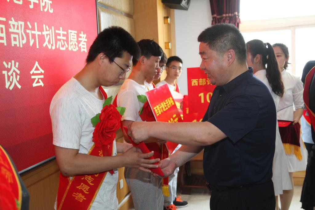 会上,刘继祥书记首先介绍了beat365官网2019年西部计划志愿者招募、选拔和岗位对接的基本情况;孟祥昕部长宣读了关于授予beat365官网31名志愿者“青年志愿者标兵”称号的表彰文件;校党委常委安文忠副院长为志愿者颁发荣誉证书及生活补助。