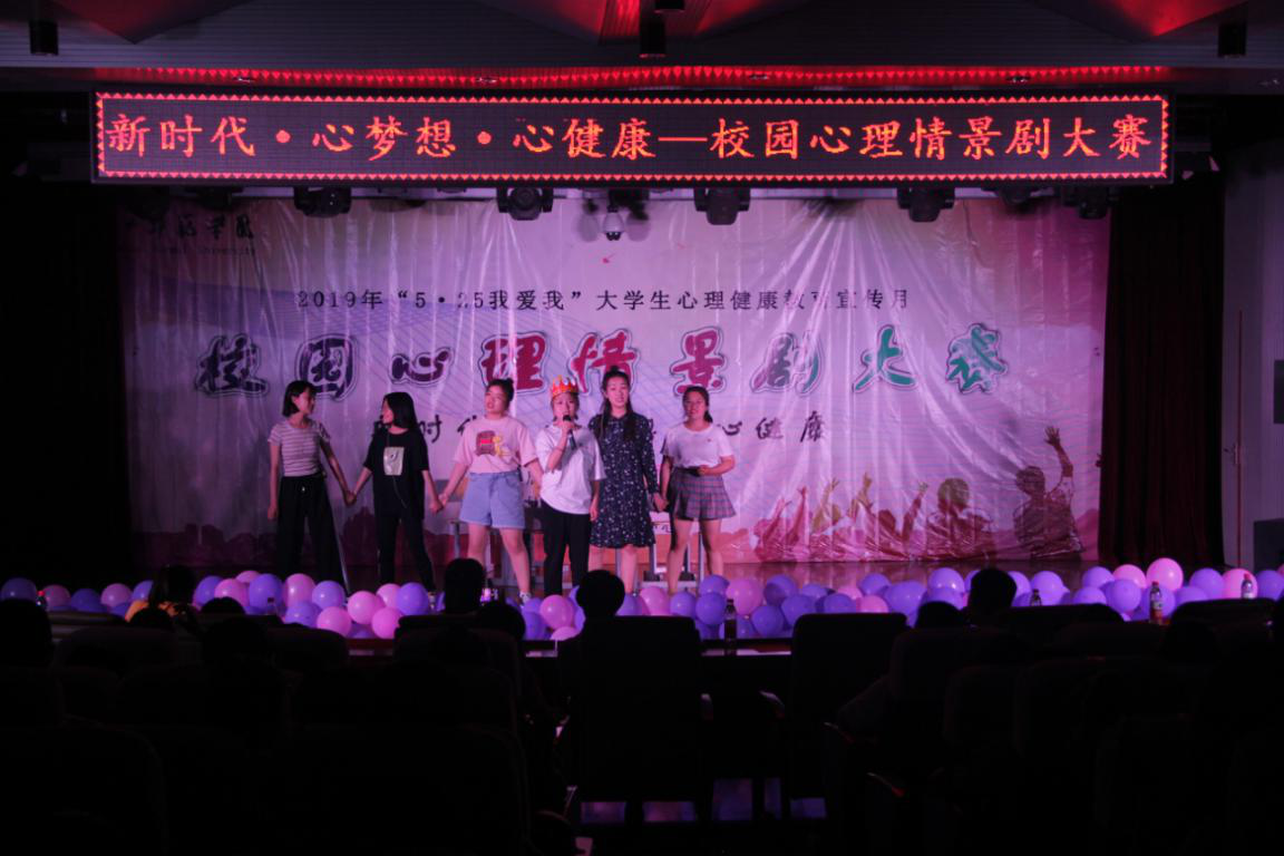 5月24日晚,beat365官网2019年“5·25我爱我”大学生心理健康教育宣传月暨第十届校园心理情景剧大赛在会议中心隆重举行,学生处副处长蔡玉梅、化学系李敏贤、外语系赵一、教育学院靳小玲、王晓宇老师出席活动并担任心理情景剧大赛评委。全校师生近400人观看比赛。
