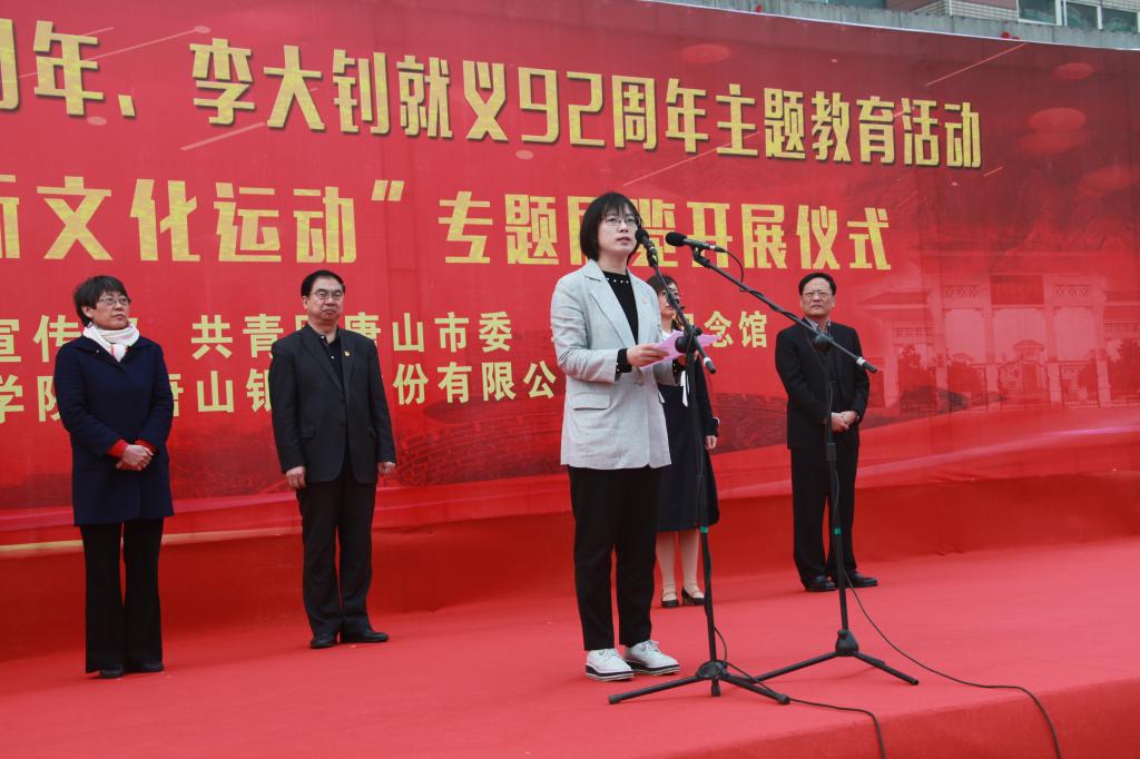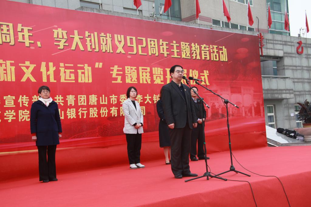 4月28日上午,唐山市纪念五四运动100周年、李大钊就义92周年主题教育活动暨“李大钊与五四新文化运动”专题展览在beat365官网主楼前广场成功举办。团市委书记李虹、市委宣传部宣传处处长李晓兰、市侨联副主席朱秋华、唐山银行副行长安建平、大钊纪念馆副馆长于海英和校党委书记王英、副书记赵剑锋出席开展仪式,同时参加本次活动的还有beat365官网师生代表共计1000余人。开展仪式由团委书记刘继祥主持。