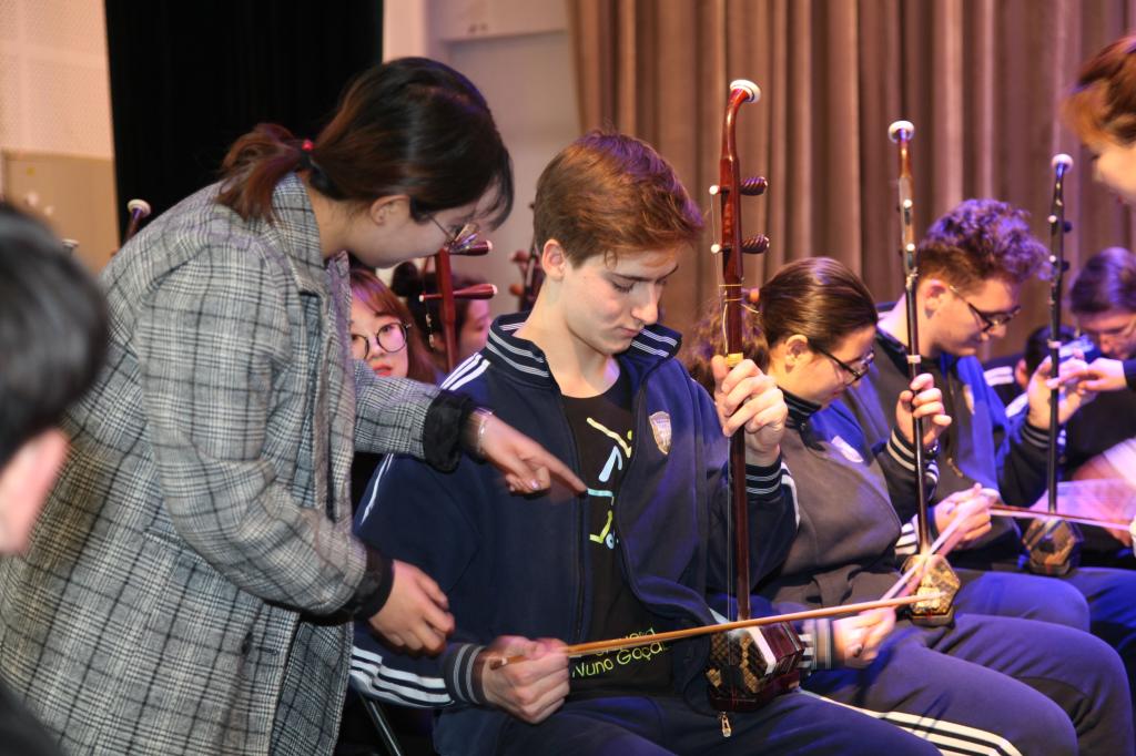 唐山外国语学校留学生尝试二胡演奏