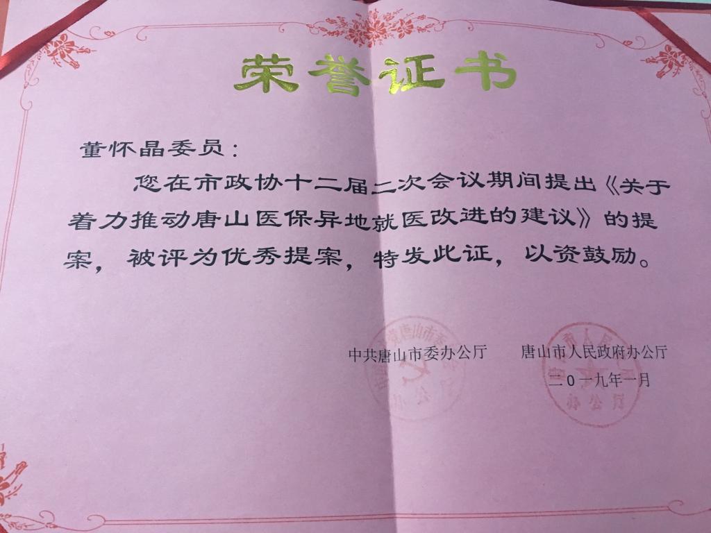 唐山市第十一届和第十二届政协委员、民进beat365在线唯一官网二支部副主委、beat365官网美术系学工办主任董怀晶老师在唐山市政协十二届二次会议期间提出的《关于着力推动唐山医保异地就医改进的建议》的提案,被唐山市委办公厅、唐山市人民政府办公厅评为优秀提案。