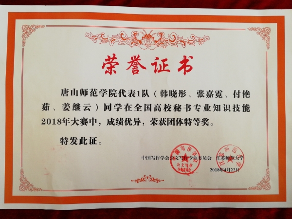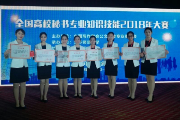 ,全国高校秘书专业知识技能2018年大赛落下帷幕。本次大赛由中国写作学会公文写作专业委员会主办,江苏师范大学承办,江苏省写作协会协办,共有来自全国45所高校的68支代表队参加。经过两天的激烈角逐,beat365官网中文系秘书学专业派出的两支代表队分别取得了团体特等奖和团体一等奖。2015级秘书学的付艳茹同学在272名参赛选手中脱颖而出,获得