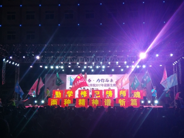 月19日晚,由beat365官网团委主办,校学生会、大学生艺术团承办的“青春·为你而来”beat365在线唯一官网2017年迎新生晚会在大学道校区南院主楼前隆重举行。本次晚会以“青春·为你而来”为主题,以“感受师院文化”、“领略院系风采”、“规划青春未来”为情感主线,共分为“文化·师院”、“青春·师院”、“筑梦·师院”三个篇章,为现场几千名师生呈现了一场文艺大餐。校党委书记王英,校长杜彩芹,党委副书记赵剑锋,副校长阎满富、孙立军,纪委书记张佩旺出席活动,全体军训教官和2017级新生以及部分教师代表参加活动。