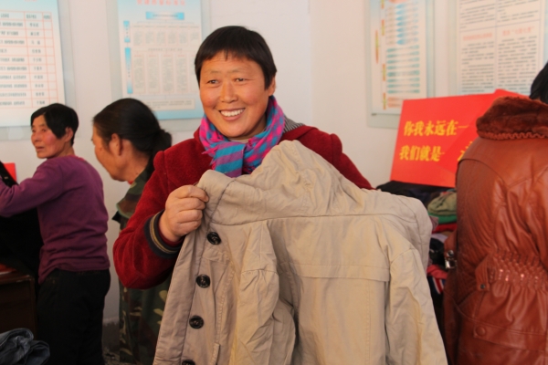老早就有村民在会议室外面等候。衣服都放好后,工作组的王璐和沈方开始组织大家入场。先是年龄大的、腿脚不太好的来选。张玉文家的阿姨走进来,王璐搀扶着她,亲自去选了一件新大衣,穿在身上试试。五组的组长马华大姐开着玩笑说:“大娘,你好像是个模特了。”马华的话,逗得大家都笑了。张大娘也开心地笑了:“是呀,感谢大家给我们送来了这么好的衣服,多少年没有穿过这么好的衣服了!”