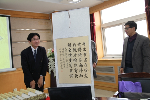 开幕式最后,会议方向日本学者海村惟一教授赠送了一幅由中文系党总支书记张学鹏教授书写的书法作品。该作品由史梦兰创作:“半生费尽几吟髭,竟博诗名海外知。自愧才输徐电发,饼金价重菊庄词。”史梦兰的《全史宫词》在其生前就传播到朝鲜和越南,其《燕说》在日本学术界也有重要影响。这首绝句用来赠与海外学者,也是恰逢其时。海村惟一教授非常高兴,表示要作为“镇馆之宝”珍存。